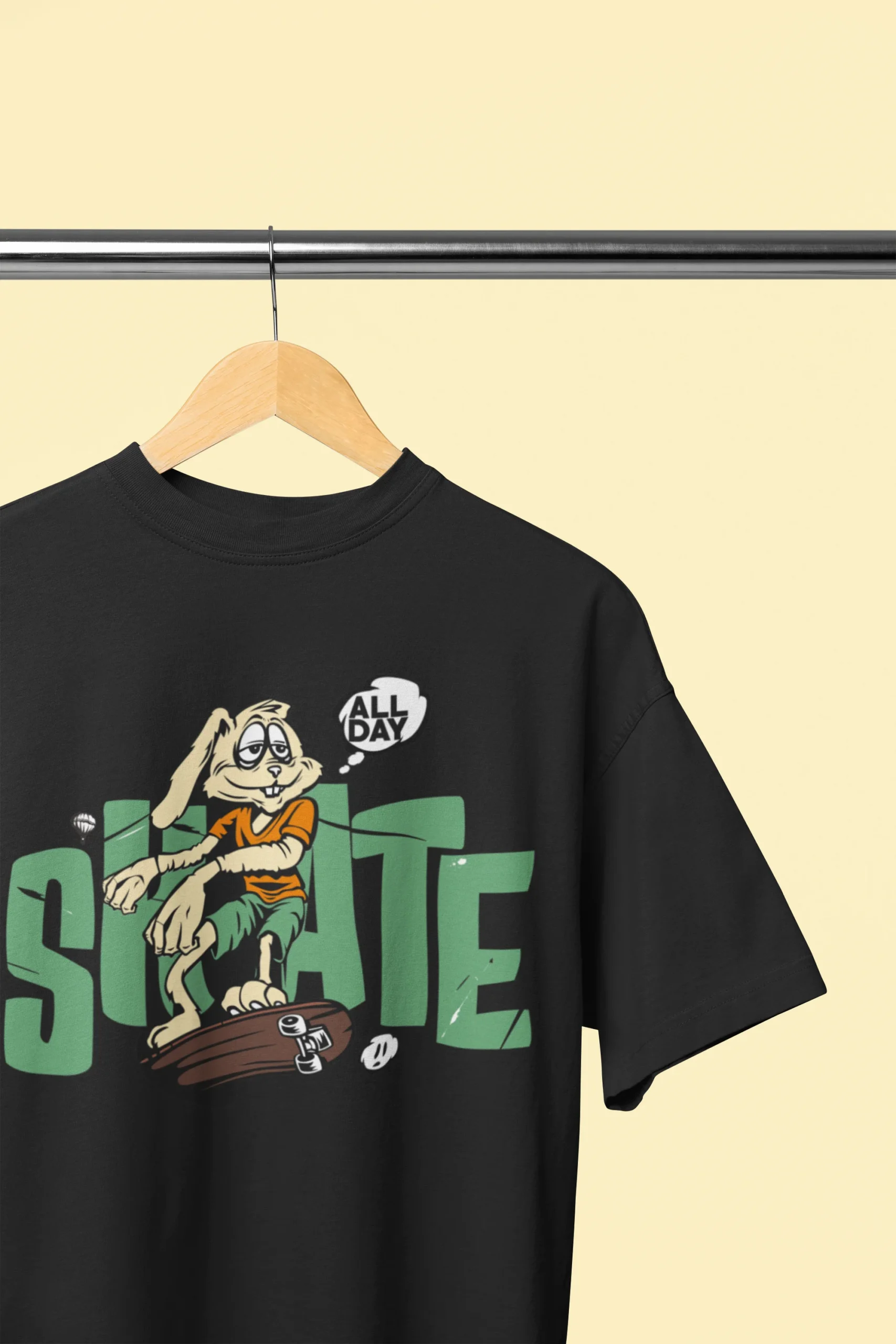 🐇 Unique Graphic: Eye-catching cartoon bunny on a skateboard with a fun “Skate All Day” vibe